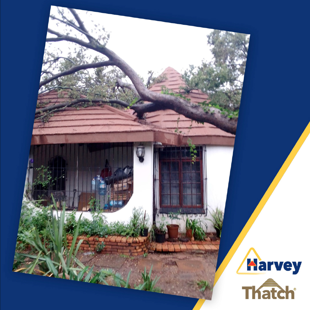 During the recent heavy rainstorms in Gauteng, a tree was uprooted and tumbled onto this home with a Harvey Thatch roof. Thanks to its strong, durable design, the roof held firm, preventing the tree from breaking through and minimizing damage!